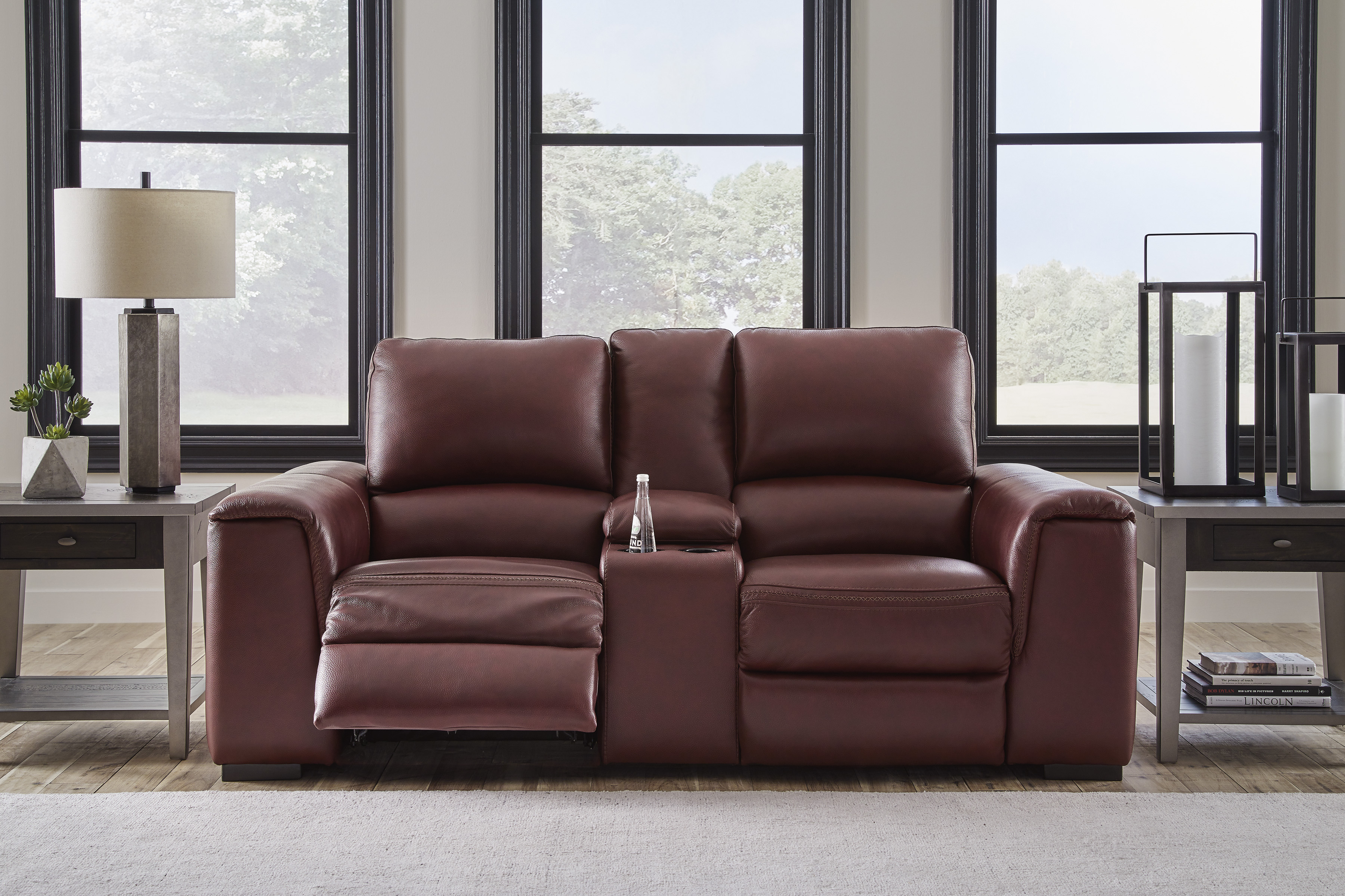 Impressive in scale while keeping an air of refinement, this power reclining loveseat stuns with soft, supple leather match upholstery in garnet. Sink into real leather in the seating area and inside back while catering to your comfort with one-touch power reclining and an adjustable headrest. Complete with USB charging, this loveseat makes a surefire statement in your contemporary living room.