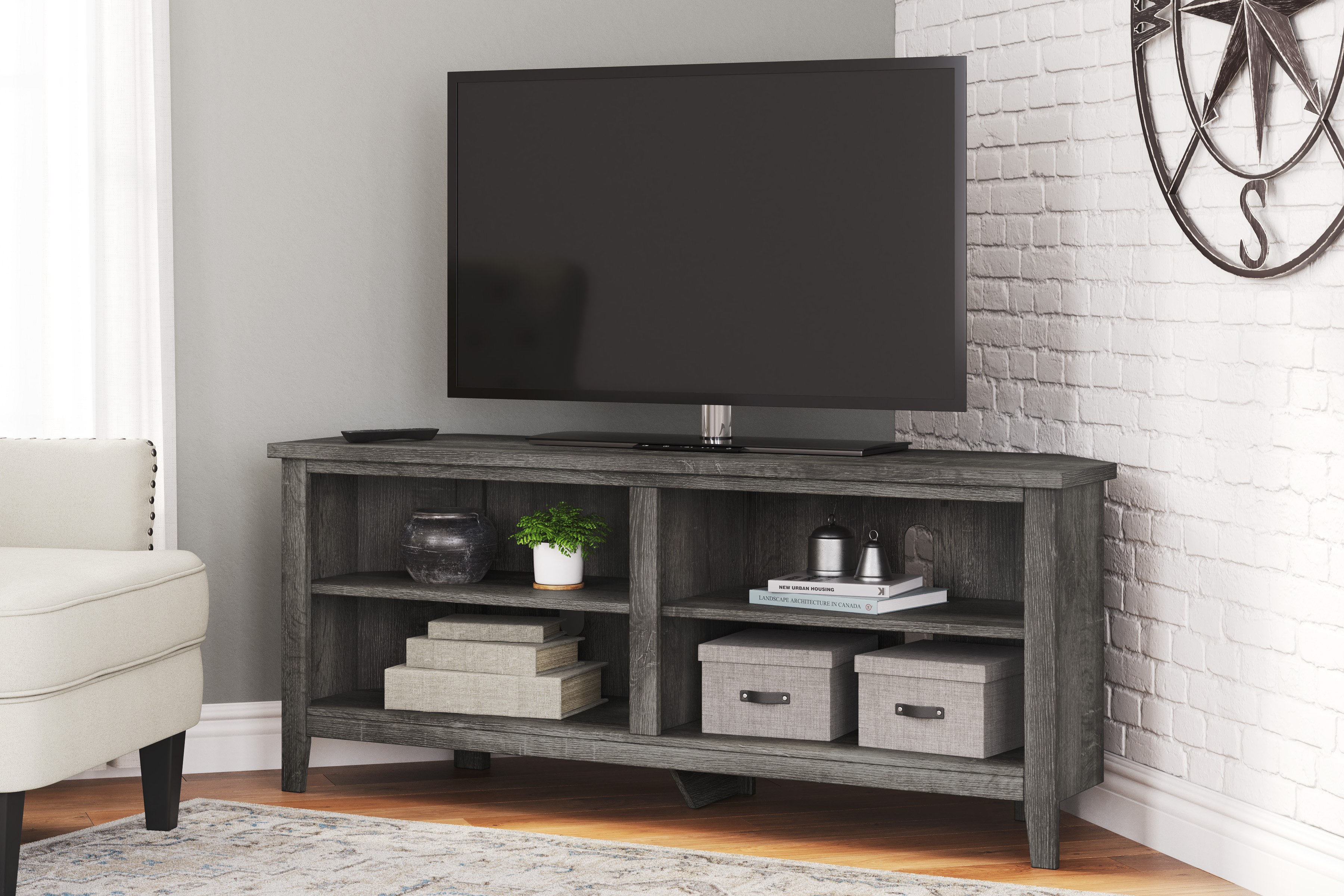 With its replicated weathered oak finish and authentic charm, this corner TV stand is right in tune with your relaxed approach to high style. Beautifully shaped to nestle into any corner, it’s well equipped with shelving and cutouts for wire management. What a mastery in modern farmhouse living for small spaces.