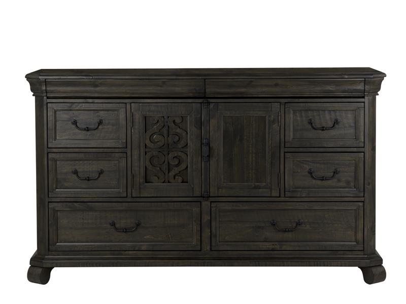 Warm and inviting like an old French friend, Bellamy welcomes with European inspired styling in a unique Peppercorn finish and matte black pewter accented hardware. Scrolling open woodwork adorns the well appointed media chest doors while roomy dressers and chests feature rounded corners atop rounded bun feet. A plethora of bed options offer upholstered tufted headboards, storage footboards, panel headboards and gorgeous shaped panels with or without sumptuous scrolled design work for a Chateau feel for any taste.