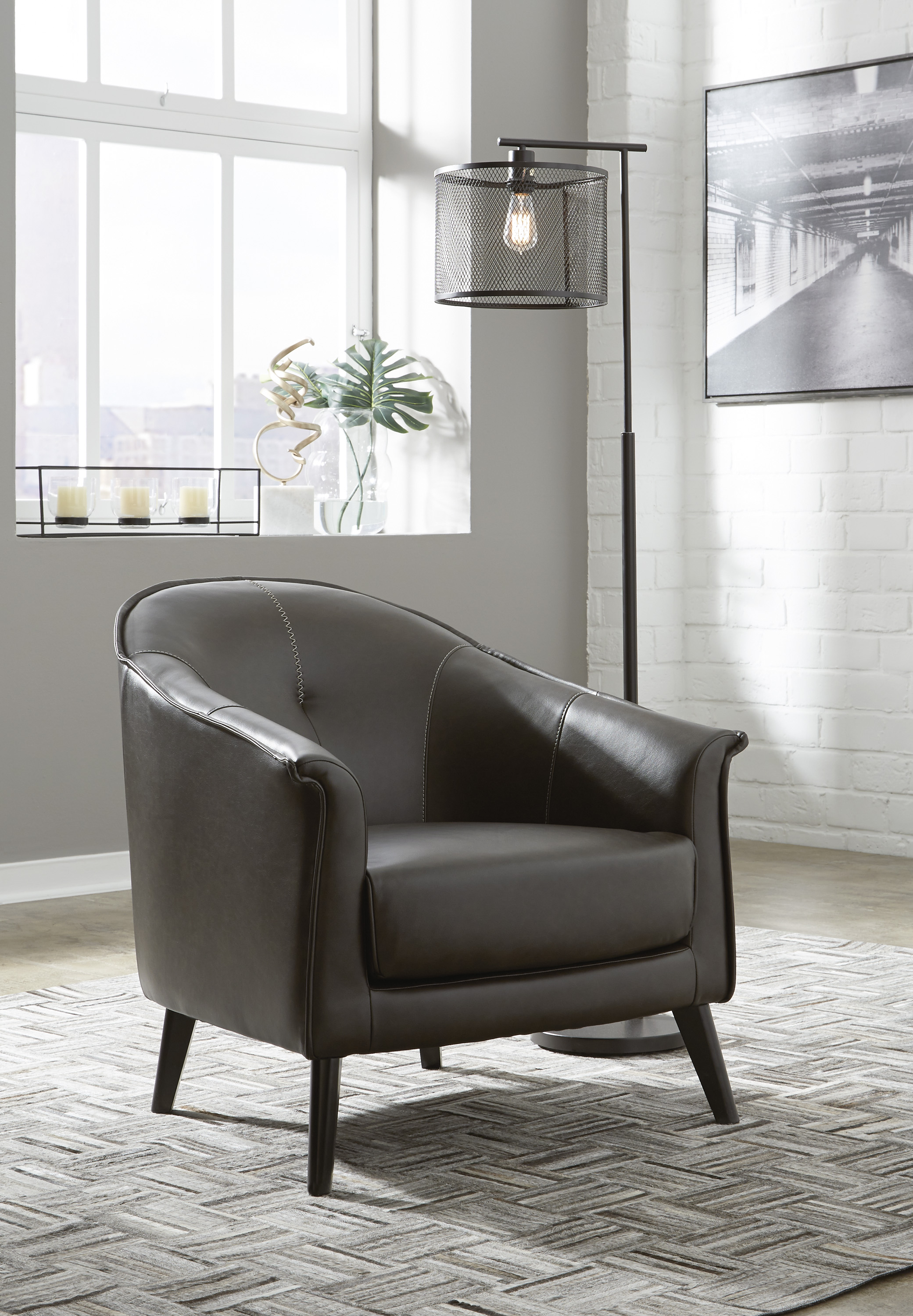 Traditional collides with contemporary in this accent chair. Flare arms, contrast stitching and tapered wood legs add a certain modernity to a classic club chair silhouette in dark brown faux leather upholstery.