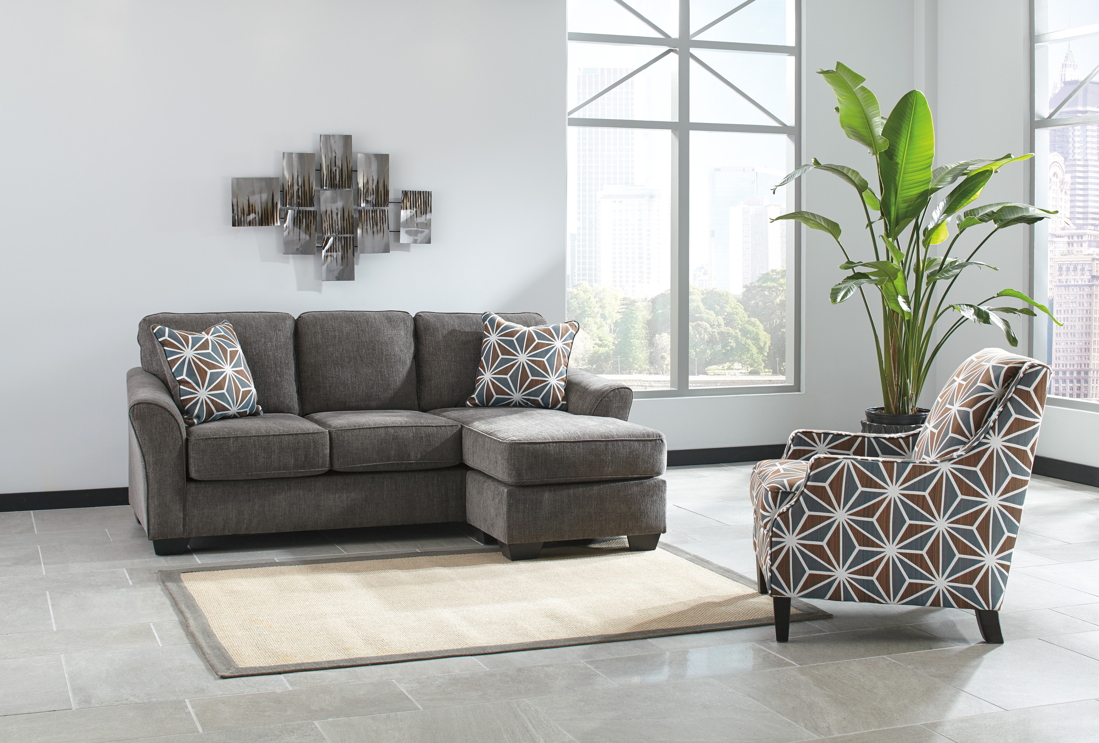 This sofa chaise is so casually contemporary. The 1970s era meets modern day allure with an energetic geometric pattern on the toss pillows. Paired together with slate colored menswear chenille, it’s incredibly comfortable and a show stopping sight. Versatile chaise has a movable ottoman and reversible cushion and can be used on right or left side.