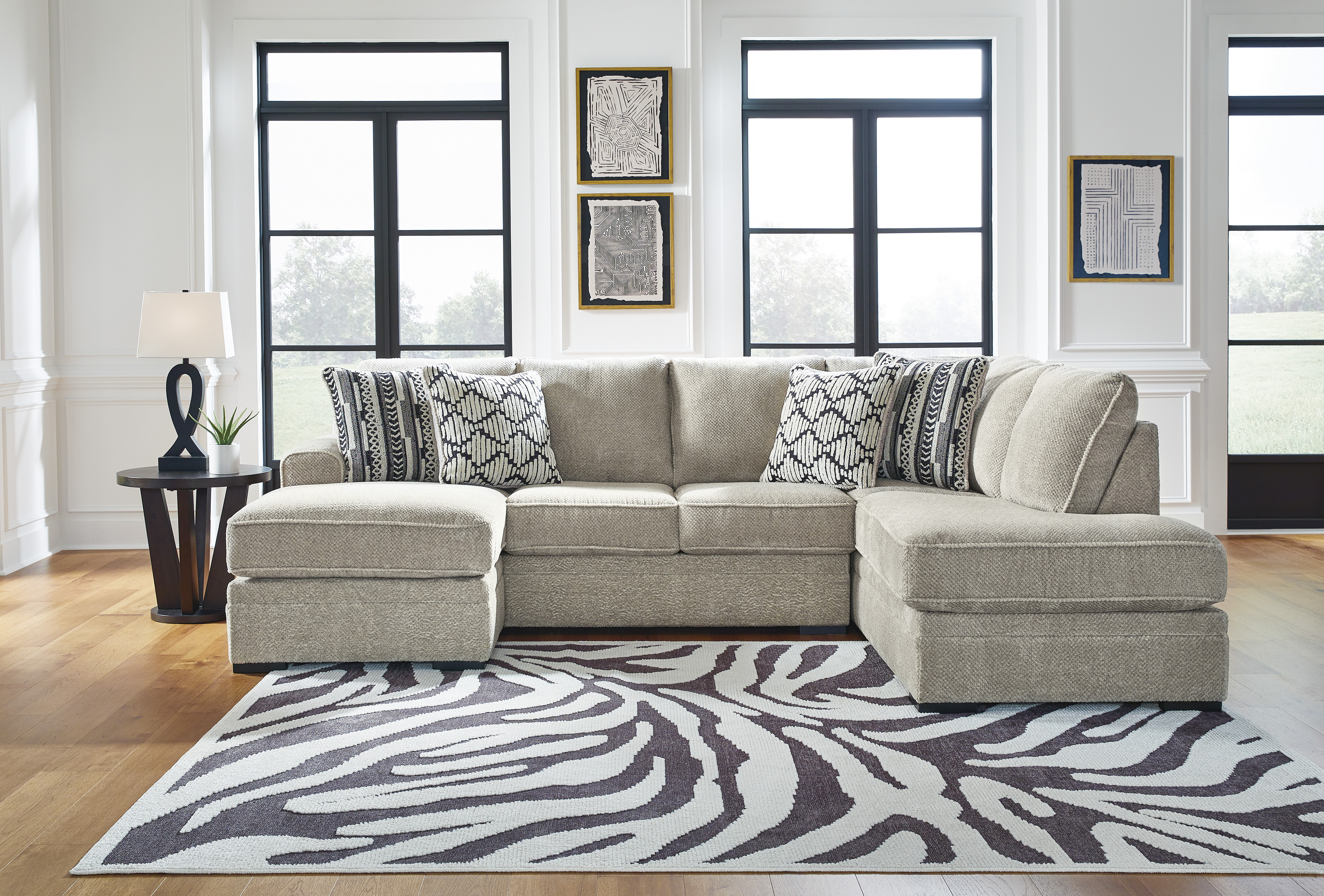 This sectional caters to your need for contemporary comfort. It's decked out in feel-good fabric in a versatile hue. Family-friendly and ideal for hosts with the most, two chaises give more people the space the sprawl out. Quality time has never been so cozy.