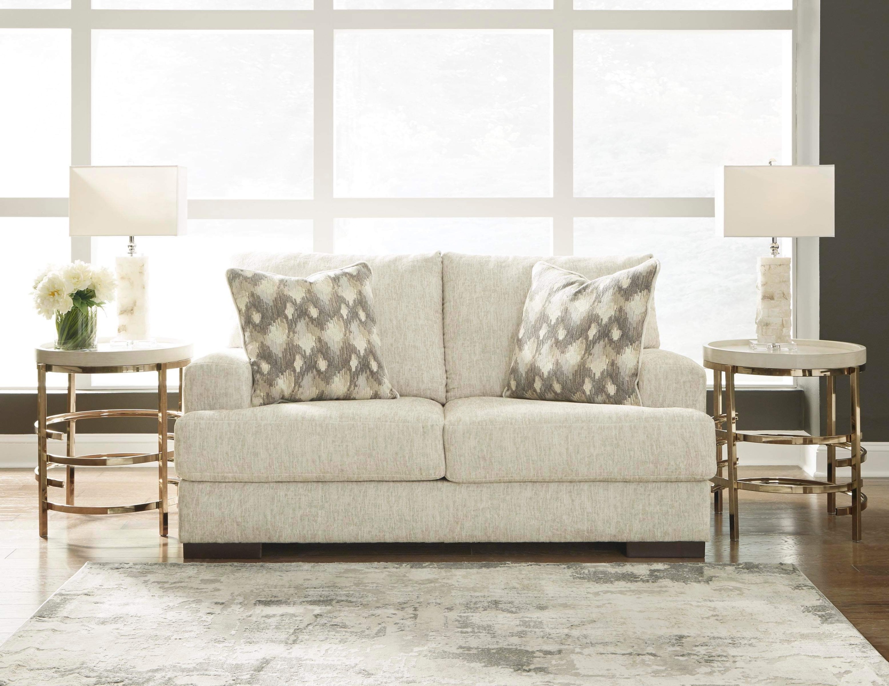 Easy on the eyes and irresistibly comfortable, this sofa s covered in luxurious chenille microfiber in a light, neutral hue that blends beautifully in a room. Wide track arms have a contemporary look and plush cushions cradle you comfortably. Textured accent pillows in complementary colors add subtle contrast.