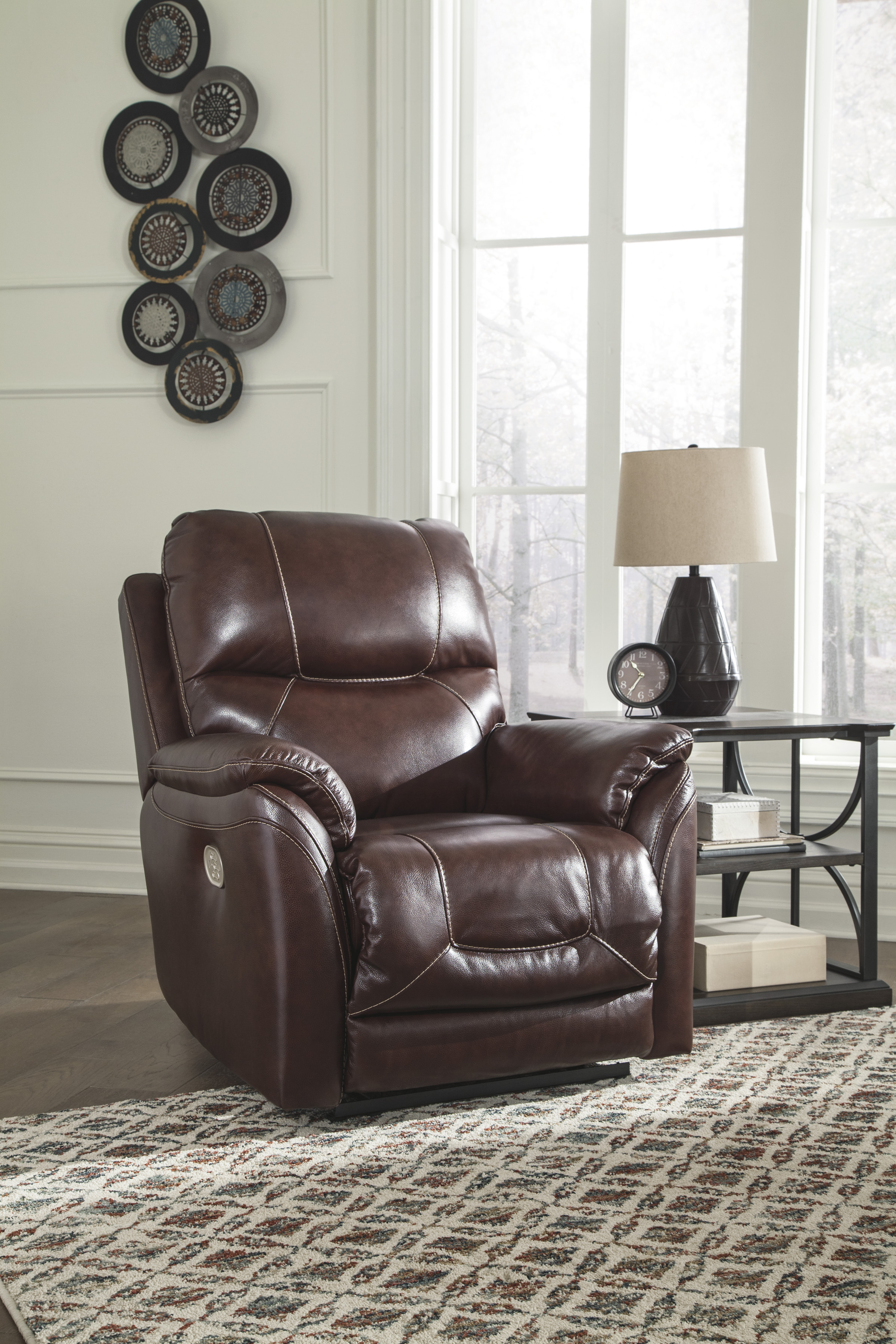 What could be better than the indulgent feel of genuine leather? How about fashion-forward looks to match. And a one-touch power control that delivers unsurpassed comfort and support. Rest assured, this power recliner with 43" high back is designed to pamper from head to toe. Sporting a real leather seating area for buttery-soft pleasure, this contemporary recliner with distinctive jumbo stitching takes it up a notch with one-touch power lumbar support and an Easy View™ power adjustable headrest that lets you fully recline and still have a primo view of the TV. Let’s not forget the USB plug-in that lets you recharge while you unwind.