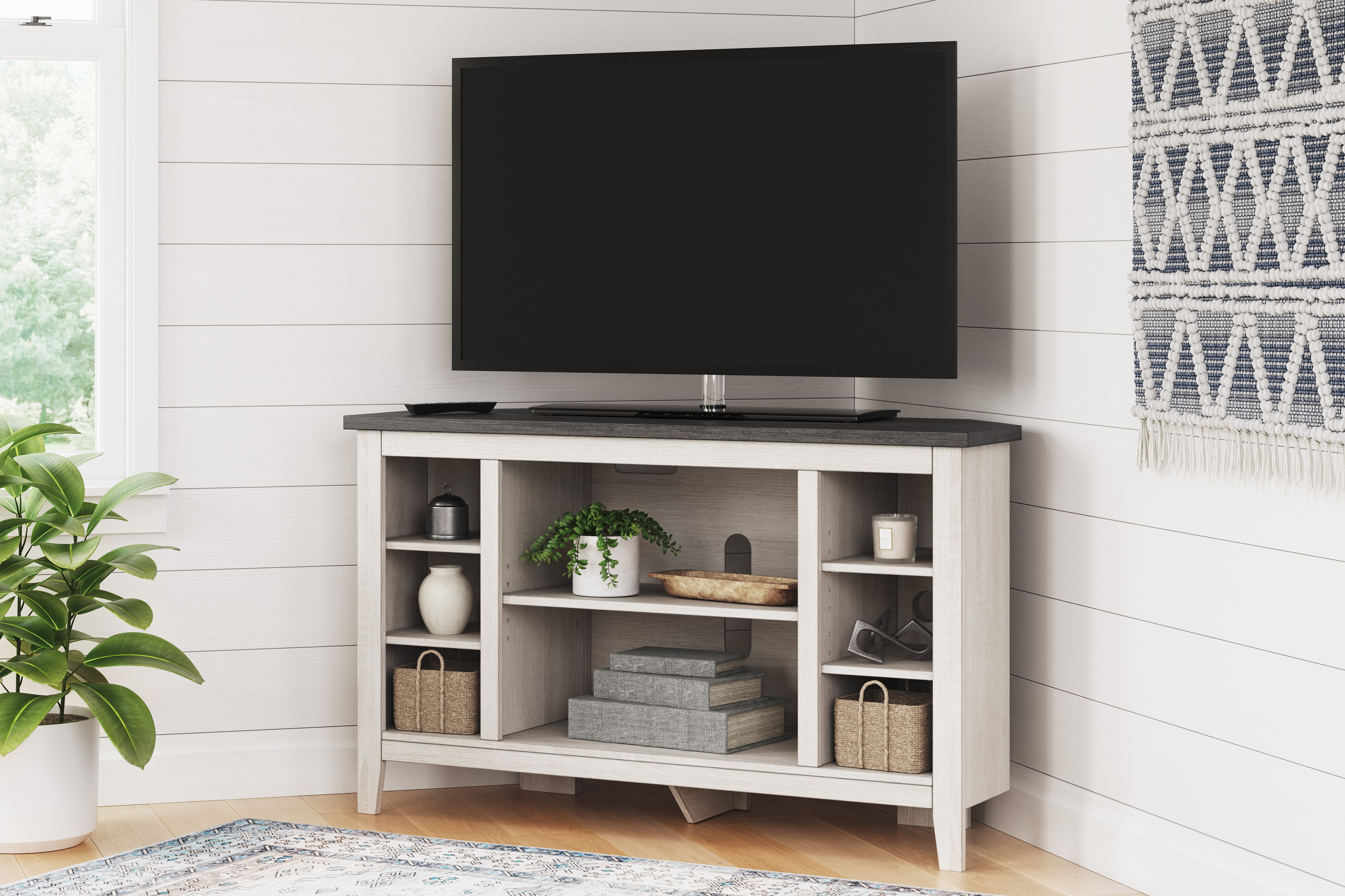 With its minimalist charm, this TV stand is right in tune with your relaxed approach to high style. Beautifully shaped to nestle into any corner, it’s well equipped with a flexible open-concept design and cutouts for wire management that enhance the clean-lined aesthetic. The look is ideal for modern farmhouse and contemporary settings.