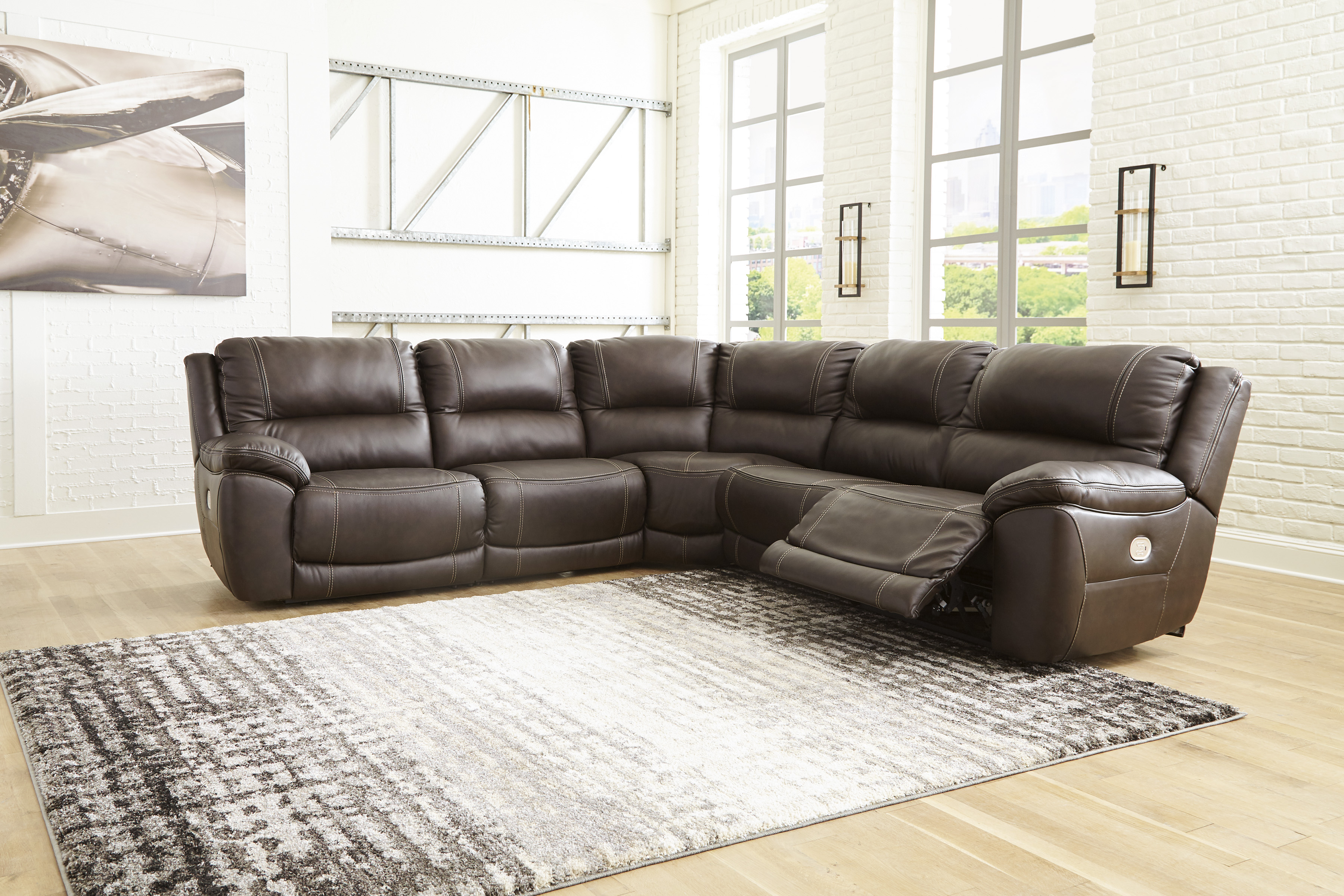 Load up on comfort in a cool, clean-lined and contemporary way with the Dunleith sectional with power headrest in chocolate brown. Rest assured, you'll enjoy the feel of real leather everywhere your body touches (real leather interior seating/matching faux leather exterior). With a wonderfully soft hand, the heavyweight material is enriched with a pebble grain effect for authentic appeal and enhanced with jumbo stitching for dramatic contrast. It features a one-touch power control with adjustable positions and includes an Easy View™ adjustable headrest that allows a primo view of the TV even when you're reclined. The extended ottoman provides extra length for leg comfort. A zero-draw USB plug-in at your fingertips lets you charge up as you chill out.
