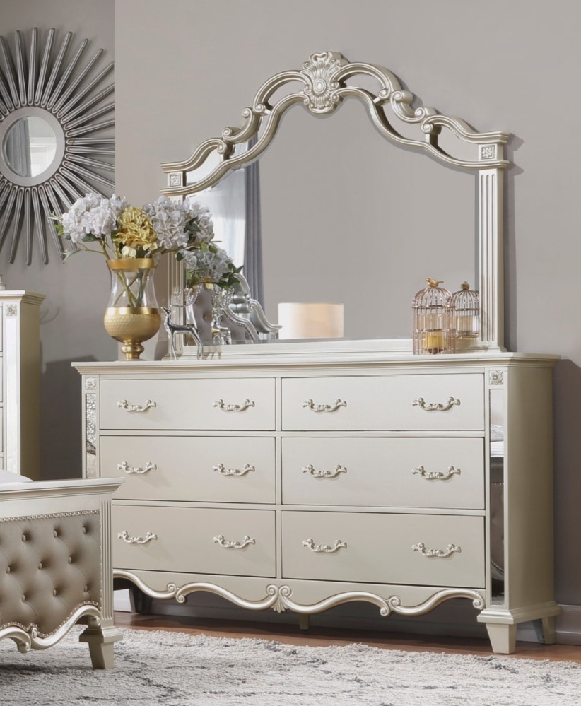 Traditional accenting is elegantly paired with glamorous flair to create the look of the Ever Collection. A champagne finish covers the dresser with mirror accent framing providing a reflection of your inspired design. Scrollwork and routing provide classic detail.