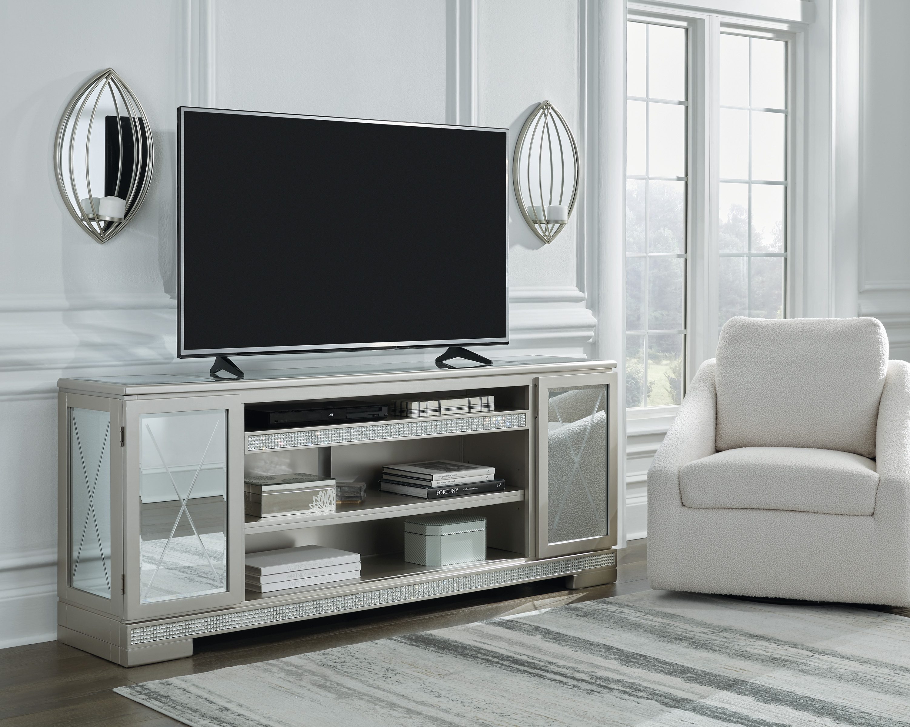 The Flamory TV Stand will add a contemporary touch to any room in your home. With its clean lines, this brilliant rectangular accent piece showcases a distinctive style for an intriguing look. The unique piece is accented with inset beveled panels and faux crystal inlay. The TV stand features two side cabinets, each with an adjustable shelf for placing various media devices, and an open adjustable center shelf with cord management. Its modern design is a useful addition to any living area.