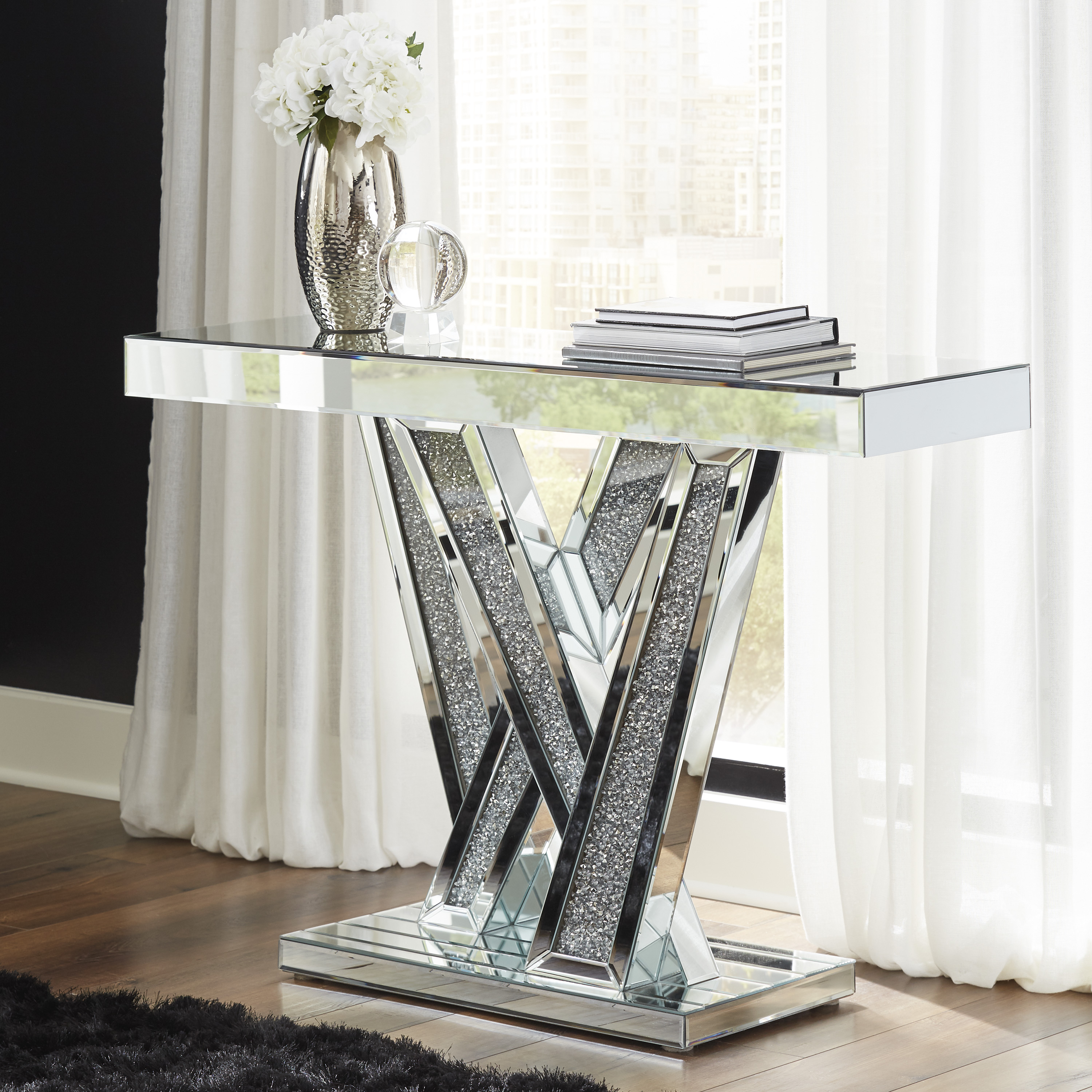 Dynamic yet sophisticated, this console table is sure to make a statement. The geometric design constructed of beveled mirror is unique and contemporary. With the crisscrossing leg supports with metallic beads adding a glitzy touch, this console table is the perfect addition to elevate any room.