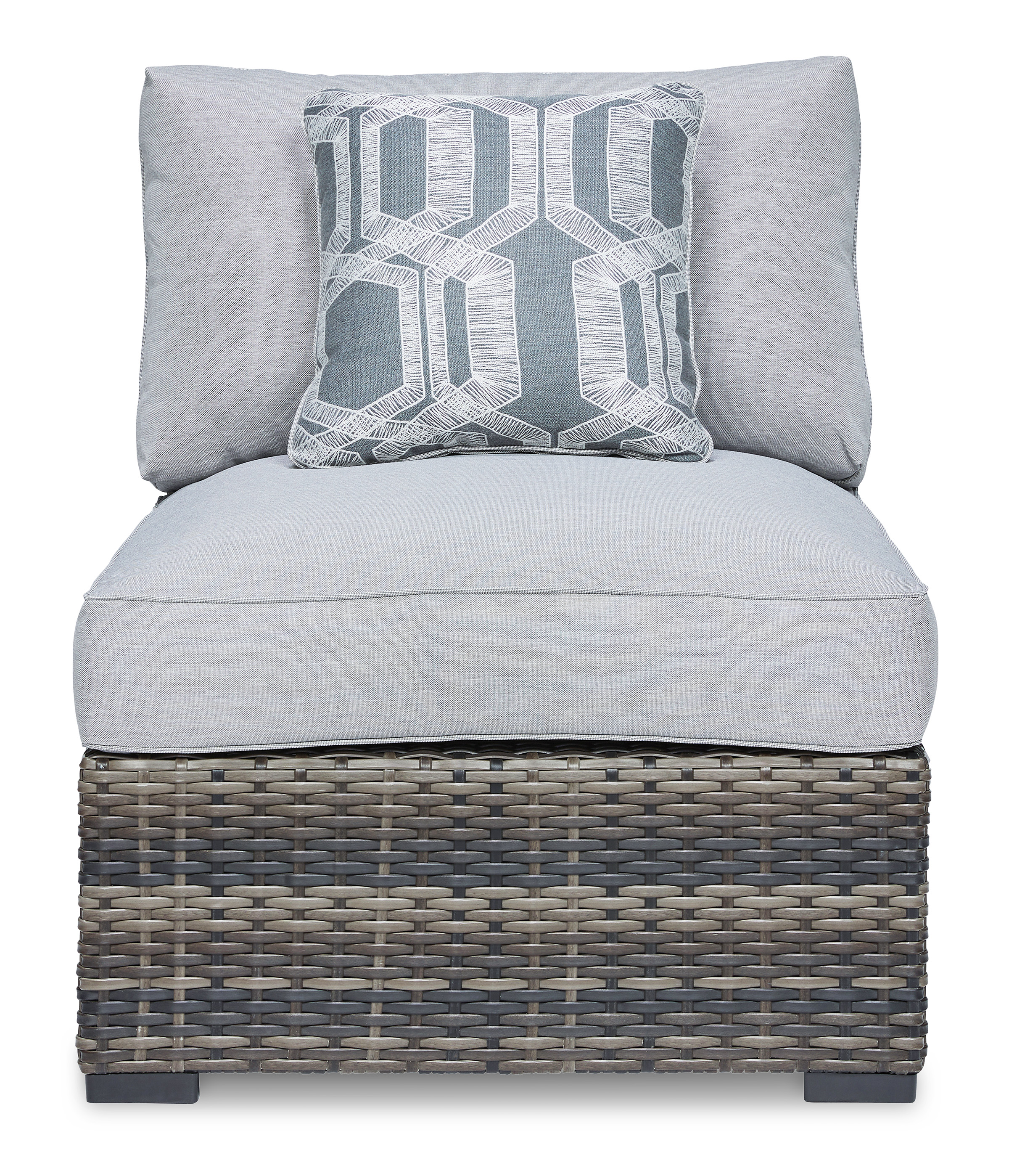 This cool, casual outdoor chair will raise the comfort level and visual appeal of your outdoor living space. Made of handwoven wicker in neutral tones of light and dark gray, the armless chair blends beautifully into your lanai or pool and patio area with thick, comfy cushions wrapped in Nuvella® high performance fabric that is stain resistant, fade resistant and easy to clean. This cushioned armless chair can be used on its own or paired with other pieces of the matching sectional to create a space that holds up to Mother Nature and ages gracefully for years of enjoyment.