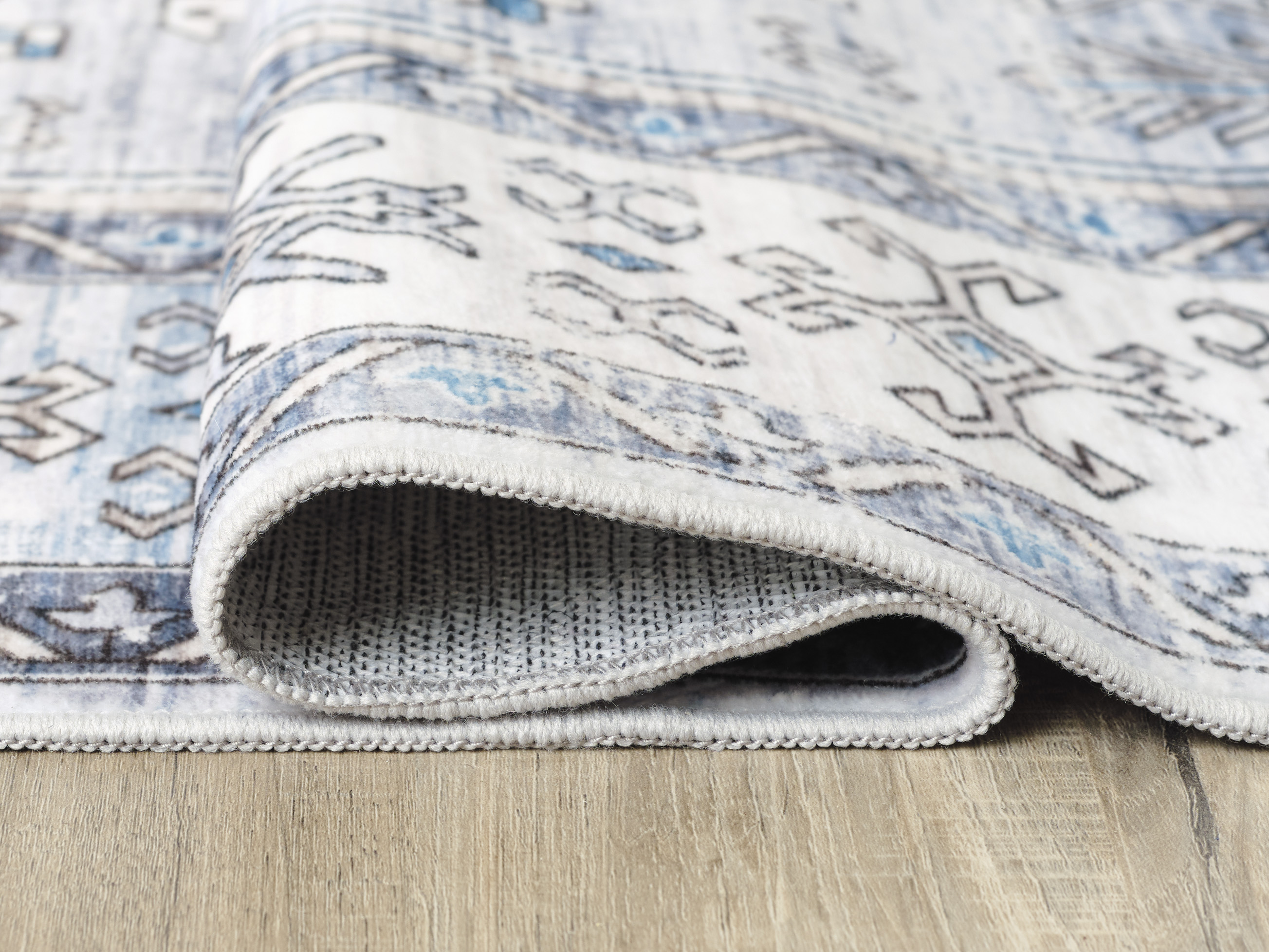 Beautifully marrying elements of modern and exotic stylings, this rug adds an air of relaxed refinement to your decor. A distressed pattern in cream with shades of blue and beige keeps things casually cool underfoot.