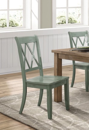 At home in a casual country setting, the Janina Collection allows for a customizable look to match the décor of your dining space. The TEal finish of the side chair’s pine veneer complements its transitional double-x back design and allows for unique accent to your dining room.
