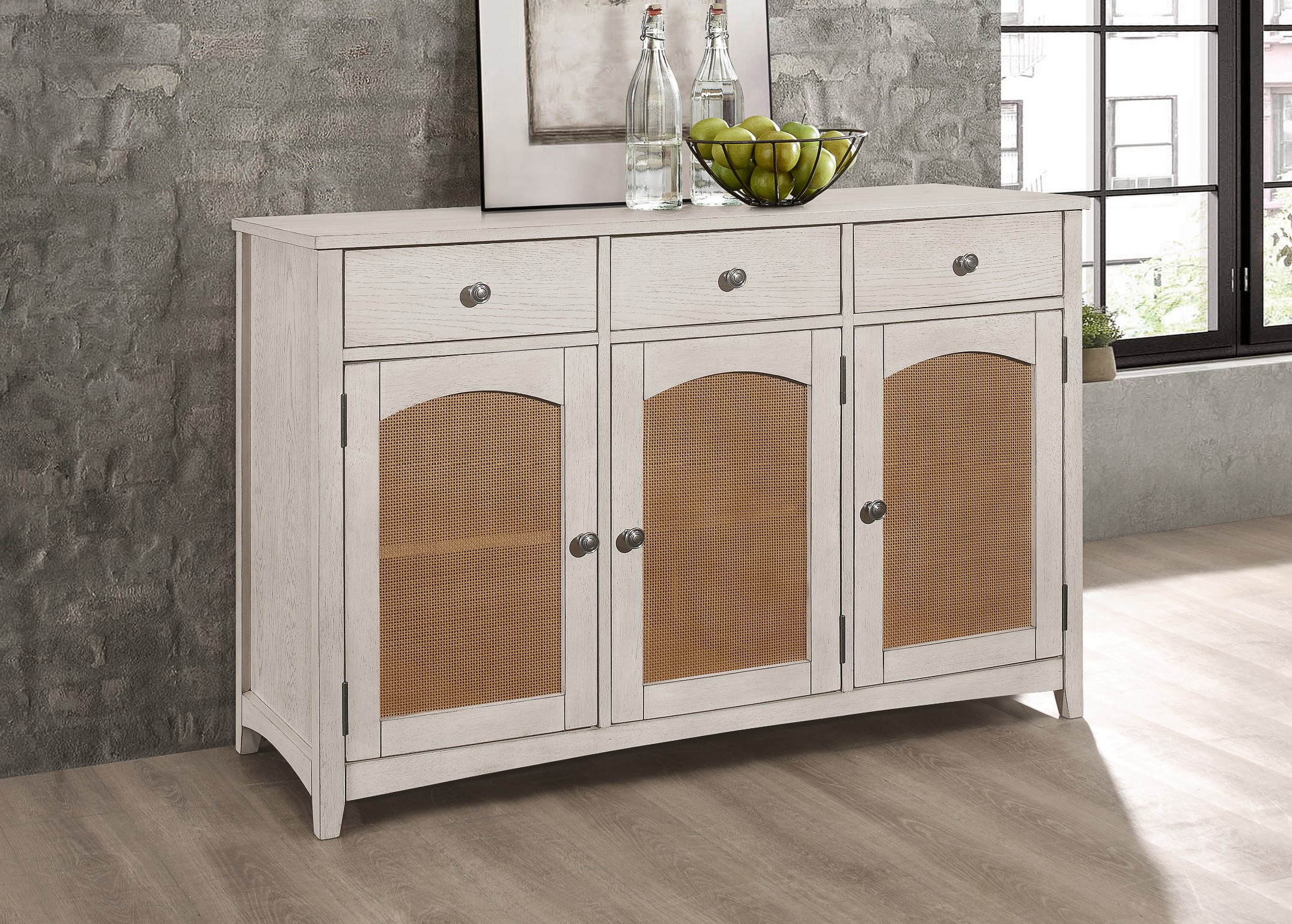 Maintain an organized transitional kitchen or contemporary dining room with this charming two-tone farmhouse style server, designed with three natural paper cane panel cabinet doors and a rustic off white finish throughout its elegant boxy frame. Round metal pulls adorn the top three drawers and bottom cabinet doors, offering a sleek and sophisticated touch to the weathered look and feel of this bohemian-like contemporary server.