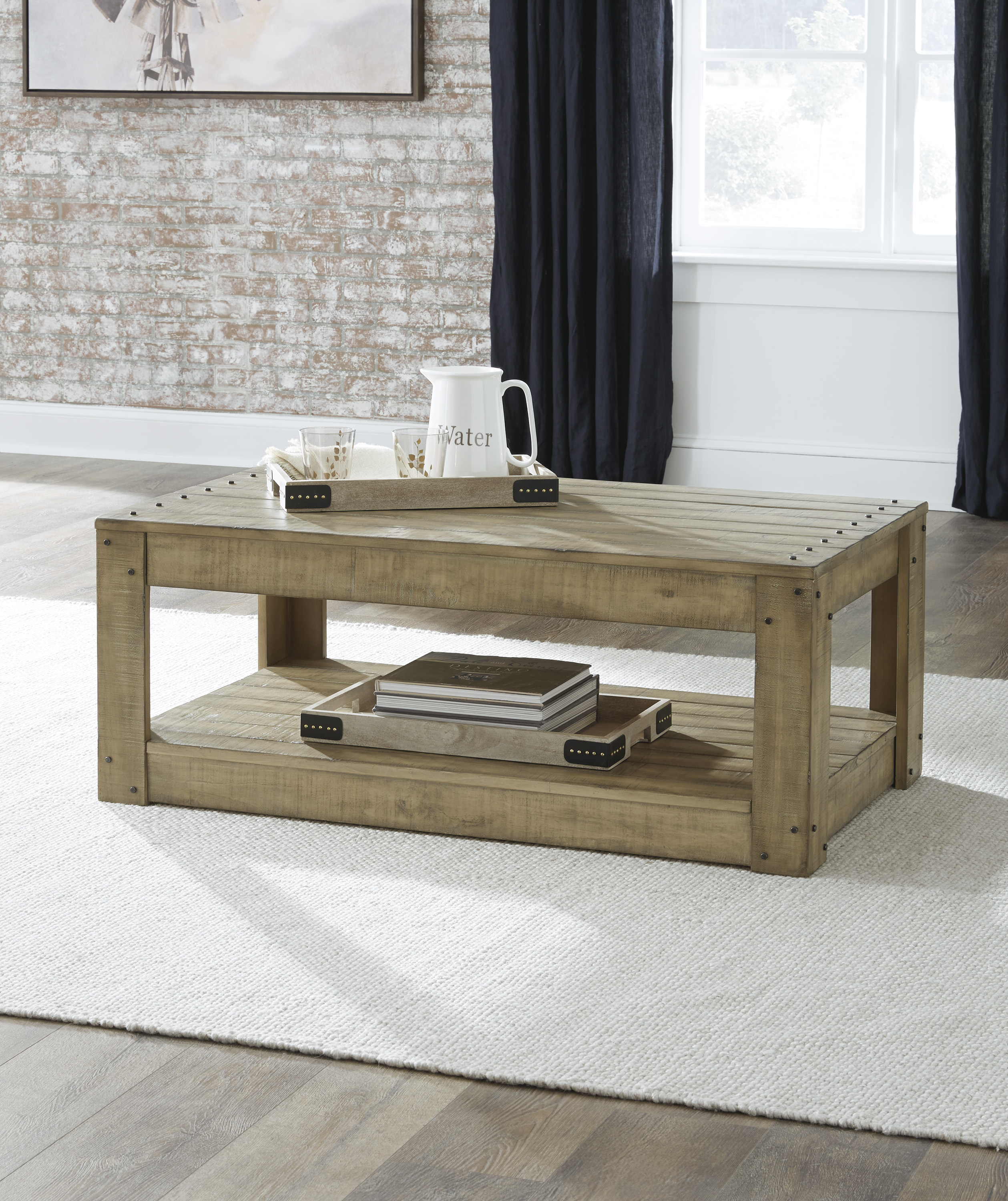 This cocktail table brings a gentle rustic feeling to your space. With prominent hardware and chunky styling, this piece adds a simple yet sturdy structure to your room. When great home design is your mission, this table is unshakeable.
