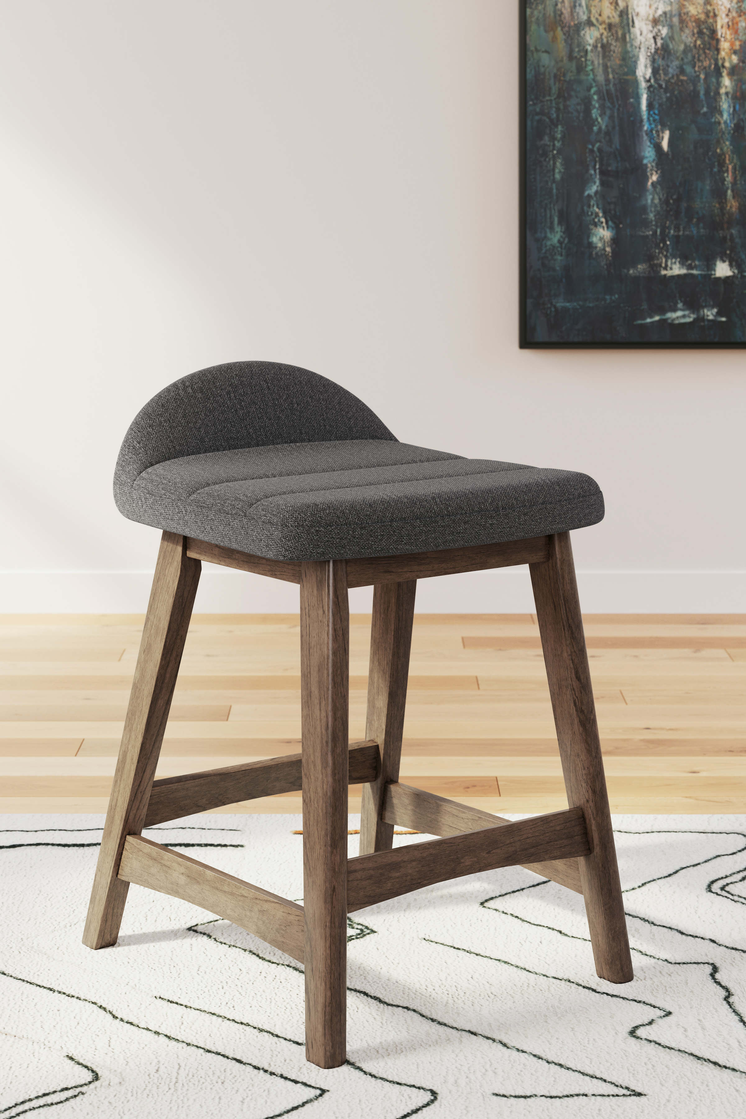A refreshed take on retro aesthetics. This upholstered bar stool adds an air of playful simplicity to your dining space, capturing the architectural language of mid-century stylings. The seat invites the eye with a soft-edged silhouette and charcoal-hued cushion. A casual, yet timeless, finish on the frame creates visual contrast to complete this study in form and function.
