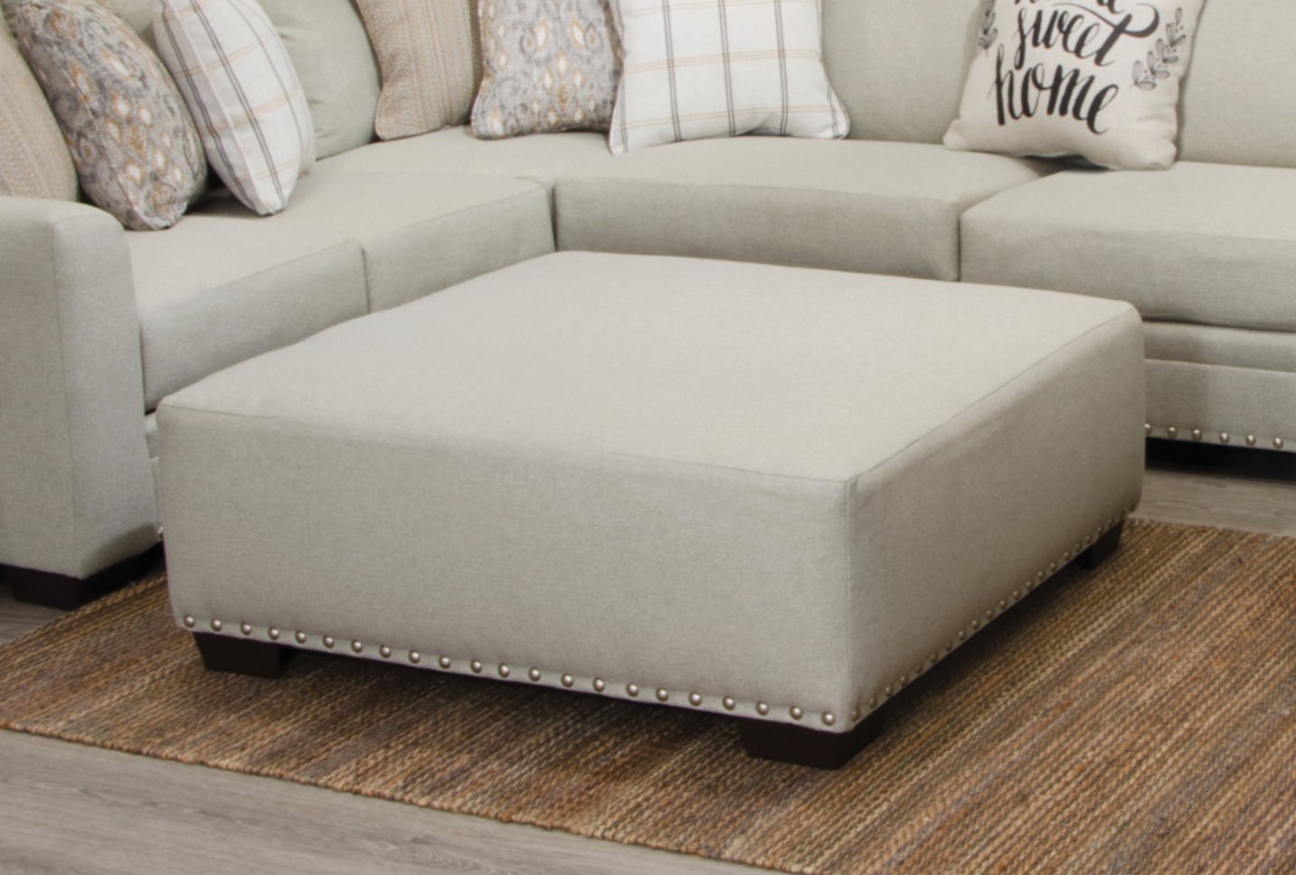 The Middleton Modular Sectional by Jackson Furniture features farmhouse casual styling, multiple configurations, soft polyester body fabric, eclectic collection of correlating pillows, decorative pewter nailhead trim, wooden pyramid legs, Steel Tech Framing and Comfort Coil Seating featuring Comfor-Gel.