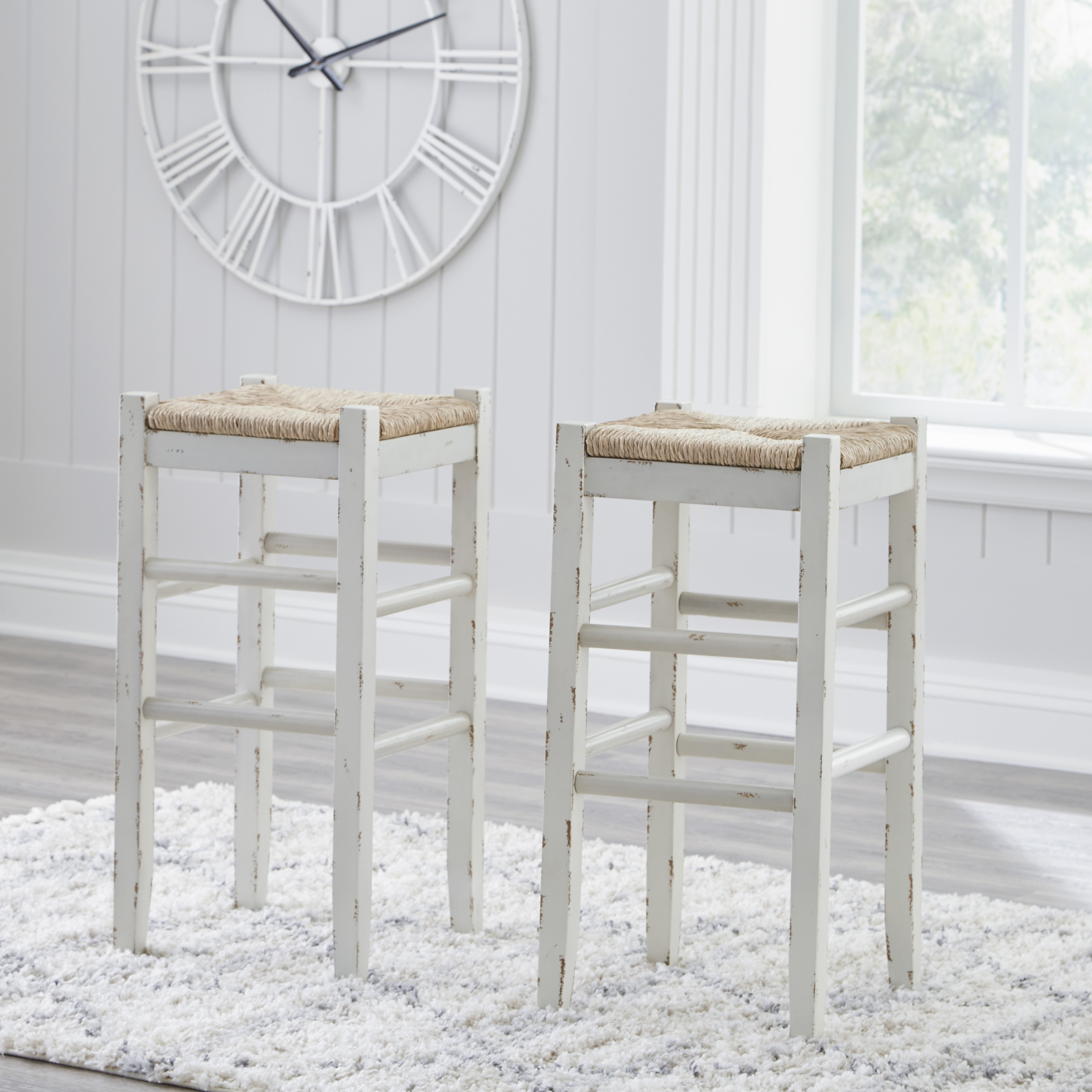 Bring the vintage casual vibe you love to the kitchen with this bar stool. A stylish seating solution in a white rubbed-through finish, this charming stool completes your dining space with ease. The woven synthetic wicker seat and wood stretchers create an effortlessly beautiful look with endless possibilities.