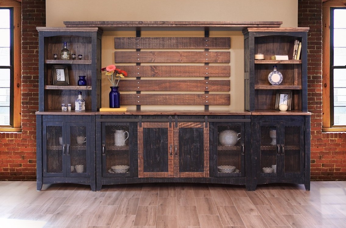 - Two tone, multi-step lacquer finish. Weathered black finish on hand- distressed wood.