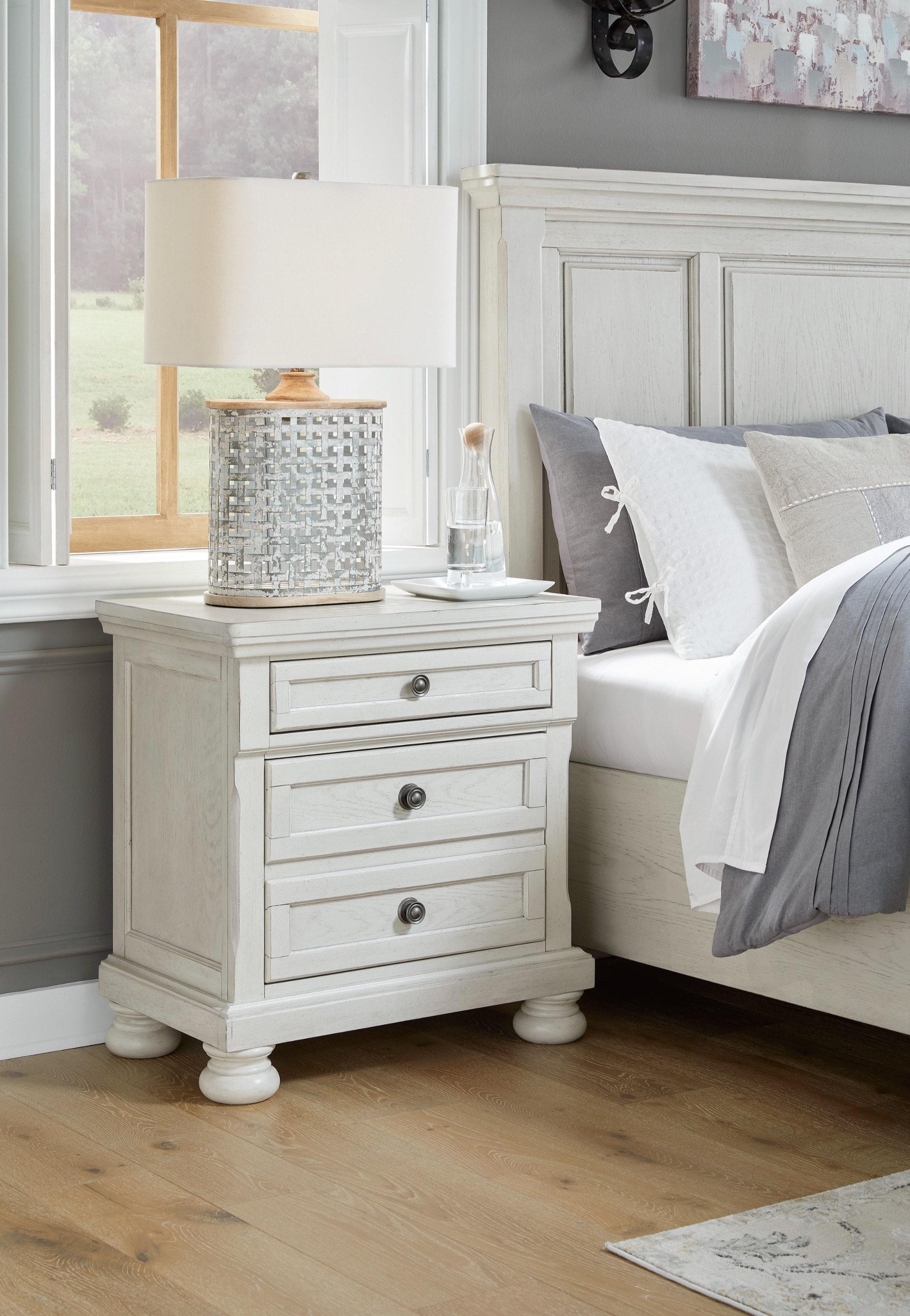 Timeless traditional design. Made with select Oak veneer, engineered wood substrate and solid wood components. Antique white finish with a wonderful grain texture. Dovetail drawer construction with metal ball bearing side glides and dark bronze-toned knobs.