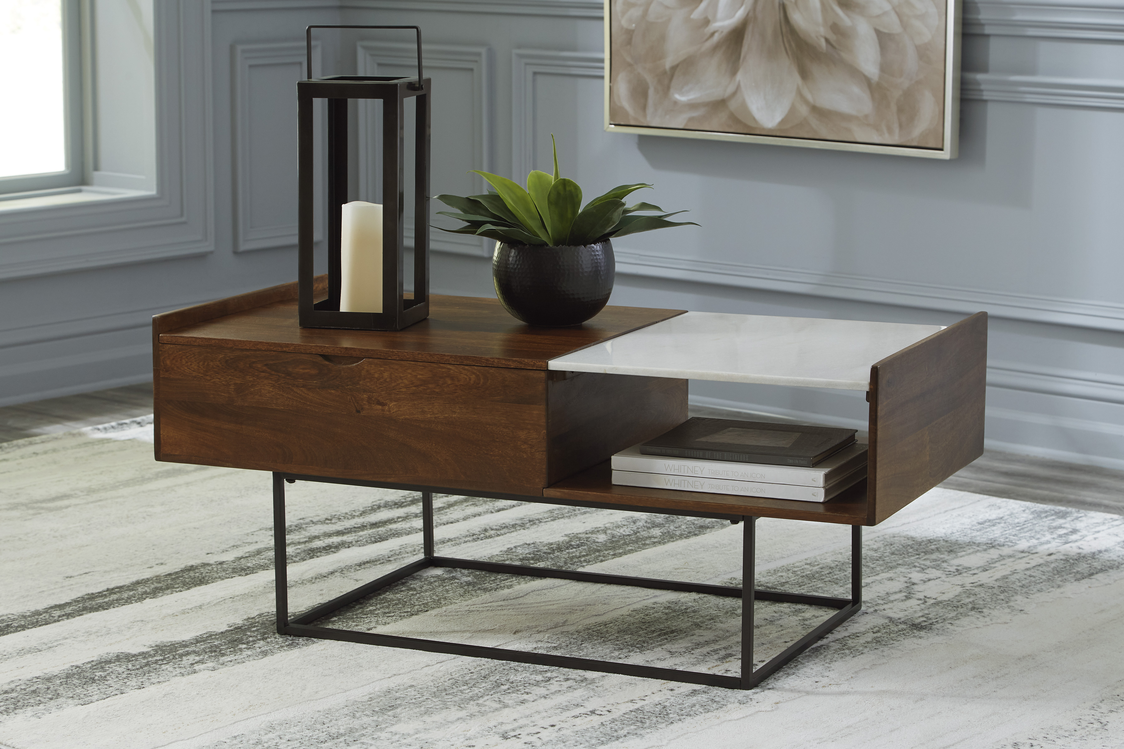 A posh and polished look for a contemporary aesthetic, this striking coffee table features solid mango wood, a natural marble tabletop and a slim metal base. Equipped with a convenient lift-top surface for working or dining from your sofa, as well as open space underneath, this beautiful coffee table easily complements modern seating arrangements.