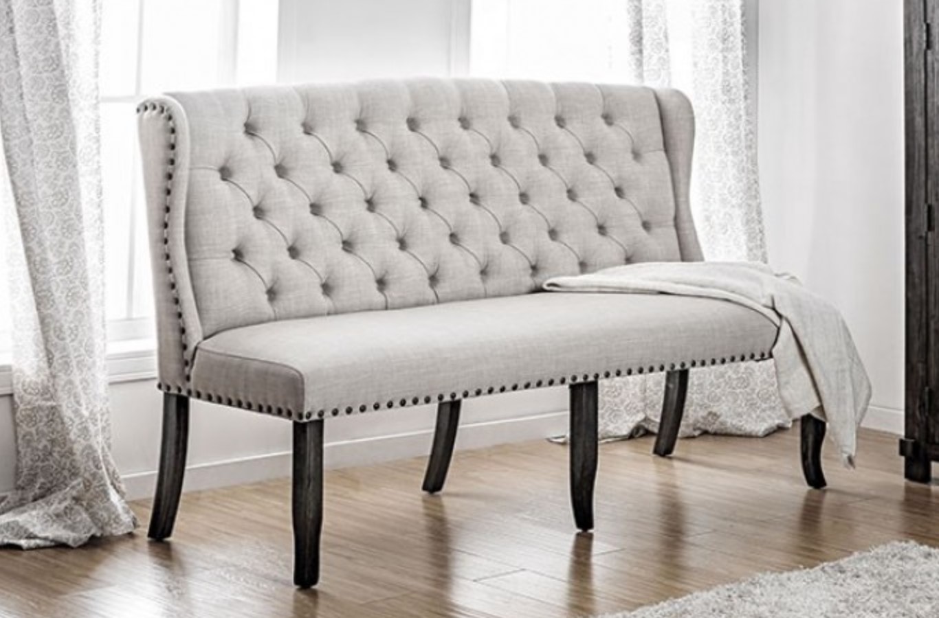 Rustic charm meets upscale design in the form of this stunning collection. This elegant linen-like 3-seat love seat bench add sophisticated appeal with its wingback sides, button tufting and nailhead trim.