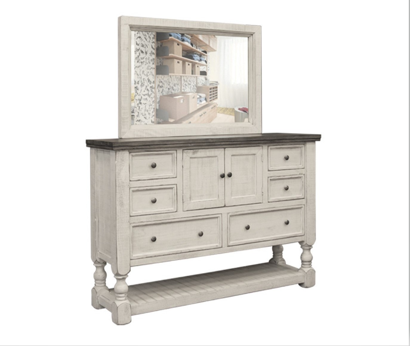 - Two tone, multi-step lacquer finish. Tops feature weathered gray finish on hand-distressed wood. & Ivory antiqued finish on the rest of the case pieces