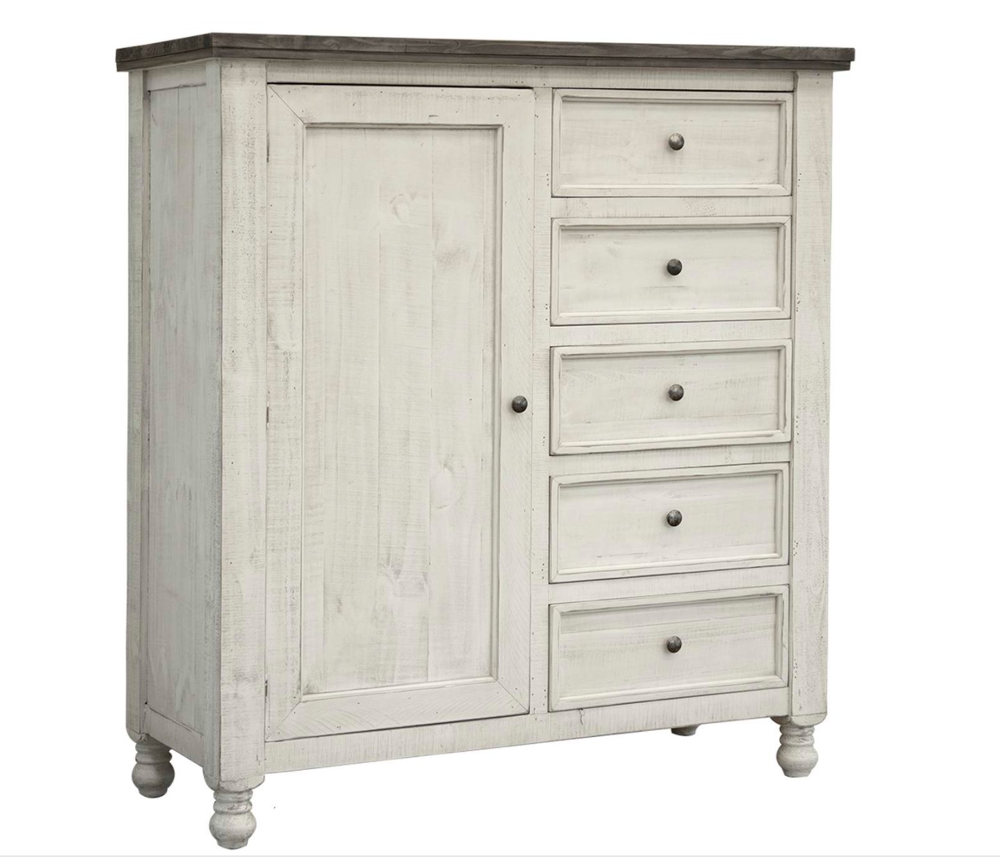 - This generous sized chest features five ample drawers and two fixed shelves behind door.
