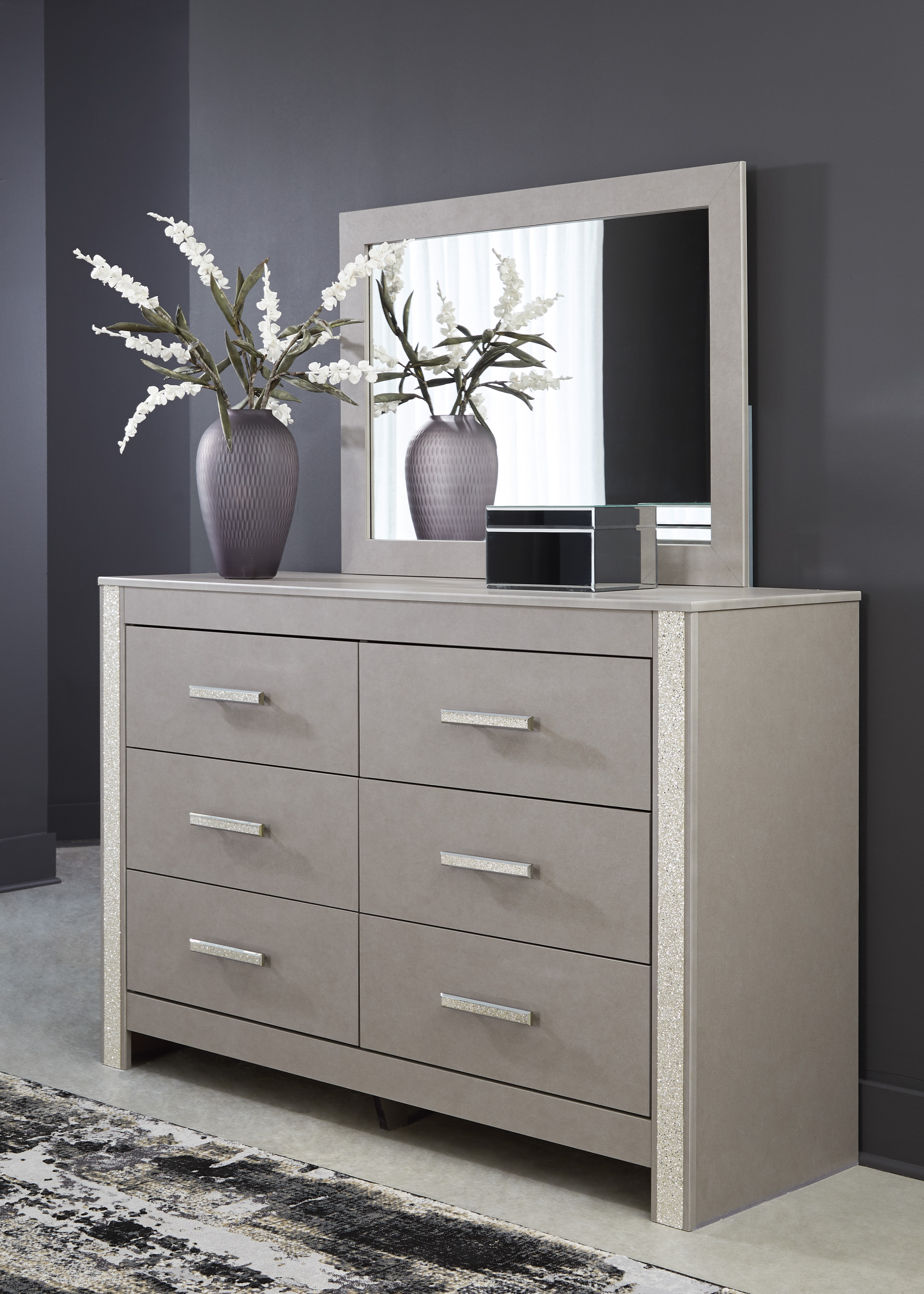 Love sleek and bold contemporary style? Drink in the beauty of this dresser. Its eye-catching details include glam glitter accents and the look of leather grain with a subtle gray finish. Large-scale linear handles, in a sophisticated champagne chrome tone, play perfectly with the streamlined aesthetic. This storage piece is a simply stunning way to achieve the bedroom of your dreams.