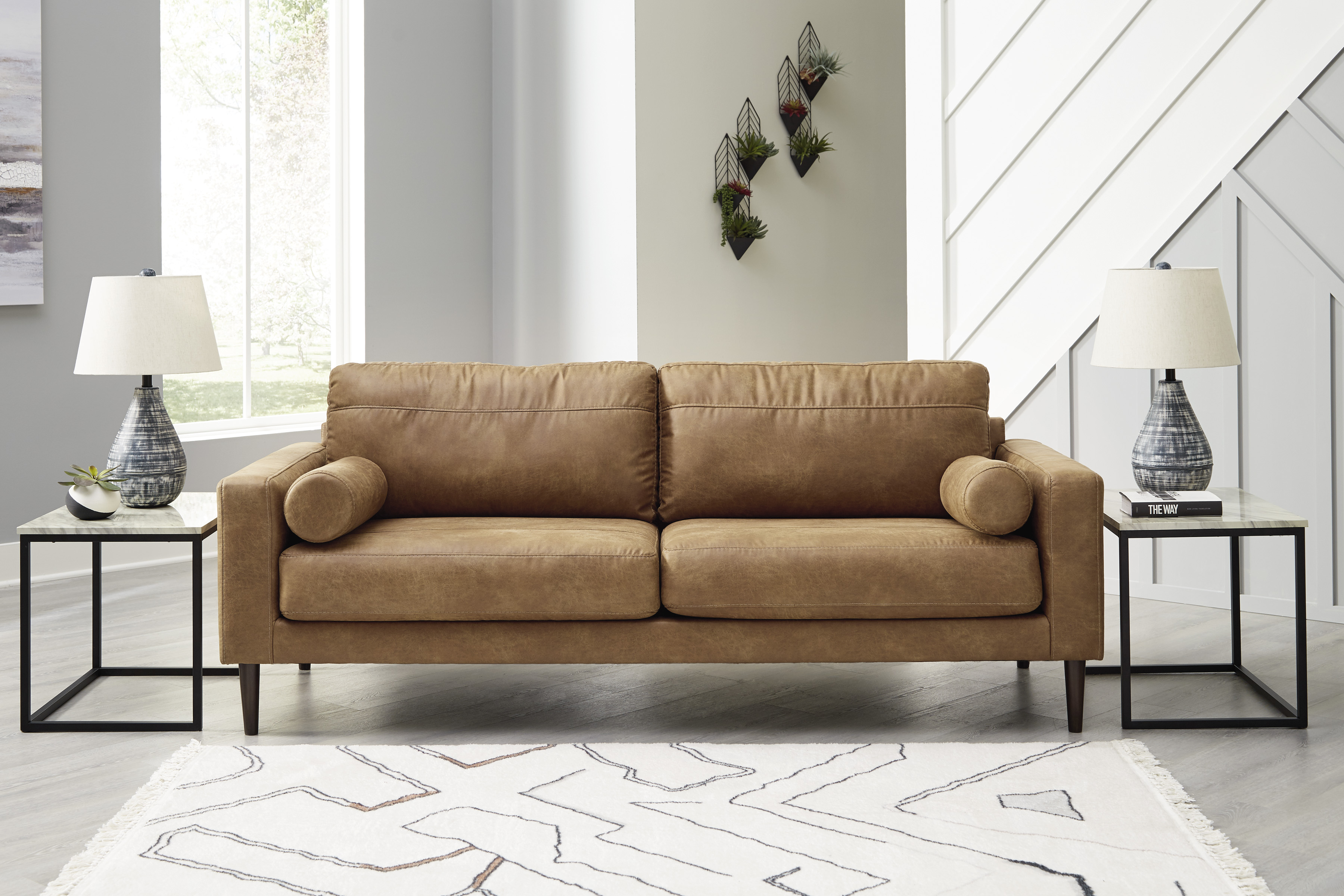 Small-scale style, tailored to perfection. This sofa echoes retro aesthetics with warm caramel faux leather, while its ultra-linear silhouette incorporates a contemporary edge. Versatile in form and function, the seat suits styles from modern boho to transitional. And its size helps you to confidently curate your compact space without sacrificing comfort (or your budget).