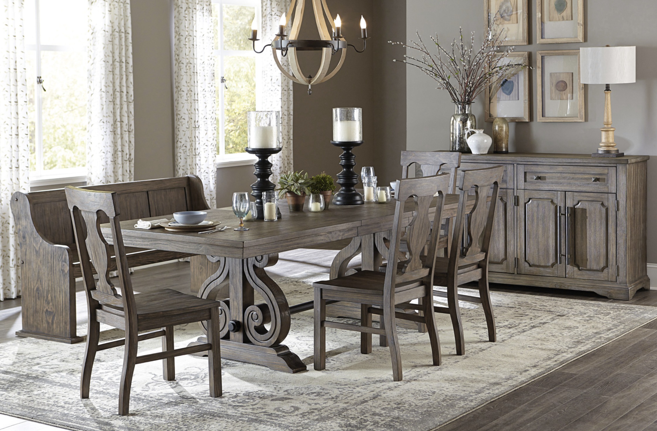 Bold curves provide elegant contrast to the unique look of the Toulon Collection. The heavily scrolled base supports of the table feature routing with dark pewter-finished metal trestle that connects. Distressed dark oak finish provides texture to the acacia veneer of the table and pine of the accompanying chairs. The optional bench takes shape with inspiration drawn from church pews, allowing for a look that will add a special touch to your dining room. The French provincial inspired routing lends decorative touch to the accompanying server, while dual drawer and door storage provides ample space to stow your tabletop accessories.