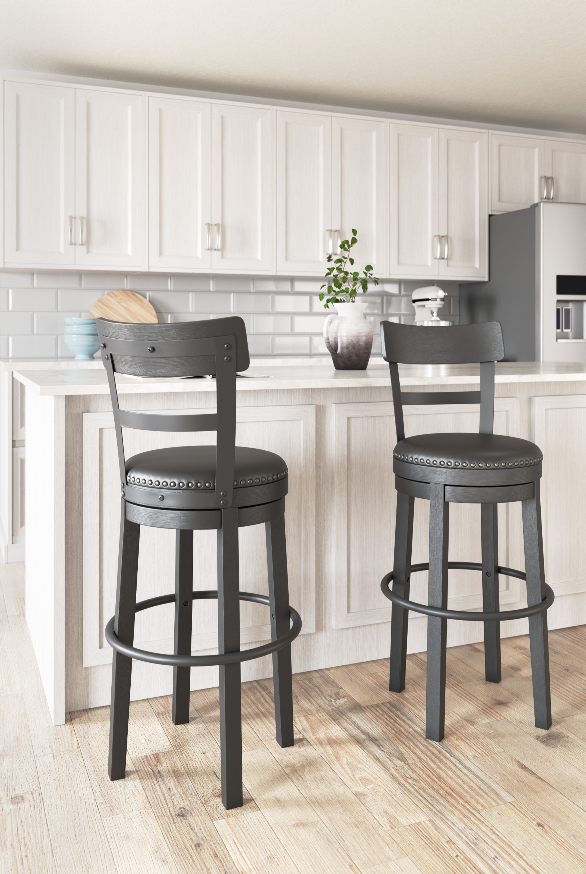 Bring a dash of drama to a kitchen island, table or counter with this upholstered swivel bar stool. The sturdy wood frame with contoured backrest is beautified with an antiqued black finish that’s a welcome change from the everyday ordinary. For your comfort and convenience, the bar stool seat is covered in a durable black faux leather designed for easy cleanup. Nailhead trim and metal accents perfect the aesthetic of this head-turning bar stool with 360-degree swivel.