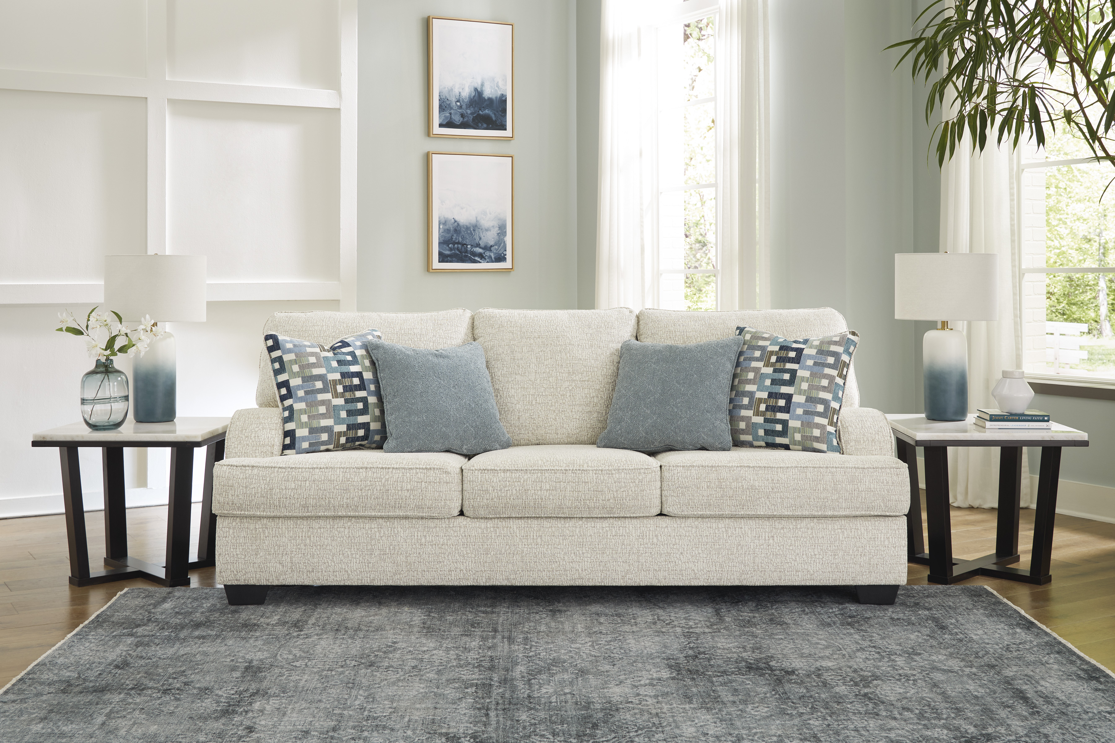 This sofa has the corner on casual contemporary style and everyday comfort. Chic and subtly innovative, its crosshatched chenille upholstery is a forward-thinking take on fashionable neutrals. The sleek frame gets a soft, streamlined touch with sloping track arms. Eclectic accent pillows further appeal to your relaxed approach to modern flair.