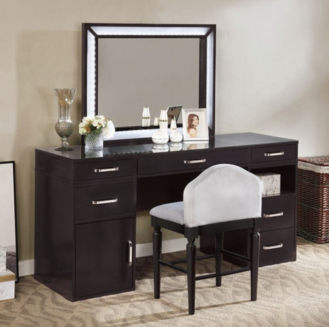 It's a gorgeous illuminated set. A beauty station that provides the right amount of space. With a multitude of drawers, the inclusion of a cabinet and open shelf make this an ideal setting for any preparing for a night on the town.