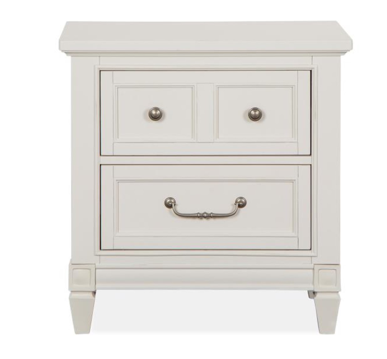 Charming and chic, Willowbrook combines a soft and casual Egg Shell White finish with classic forms to create a soothing atmosphere that relaxes mind and body. Create a serene setting with vintage silhouettes featuring breakfront shaping on the dresser, panel bed headboard and mirror, and tarnished silver hardware including a decorated knob and elegant bail pull. Crafted of Birch Veneer and Hardwood Solids with a subtle gray wash over the creamy finish, Willowbrook is at home in settings from cottage to coastal and from traditional to soft modern. The stunning panel bed has a storage footboard option with two drawers and a wood-framed upholstered headboard. Three nightstand options are offered including a two-drawer nightstand, one-drawer nightstand with two shelves, and a door bachelor’s chest. The functional door chest has a sliding wood door with wood shelves behind, five left drawers with felt-lined top drawers and one bottom drawer. From beaches to the countryside, and from mountain valleys to suburban trails, Willowbrook is a relaxing destination for the end of each day’s journey.